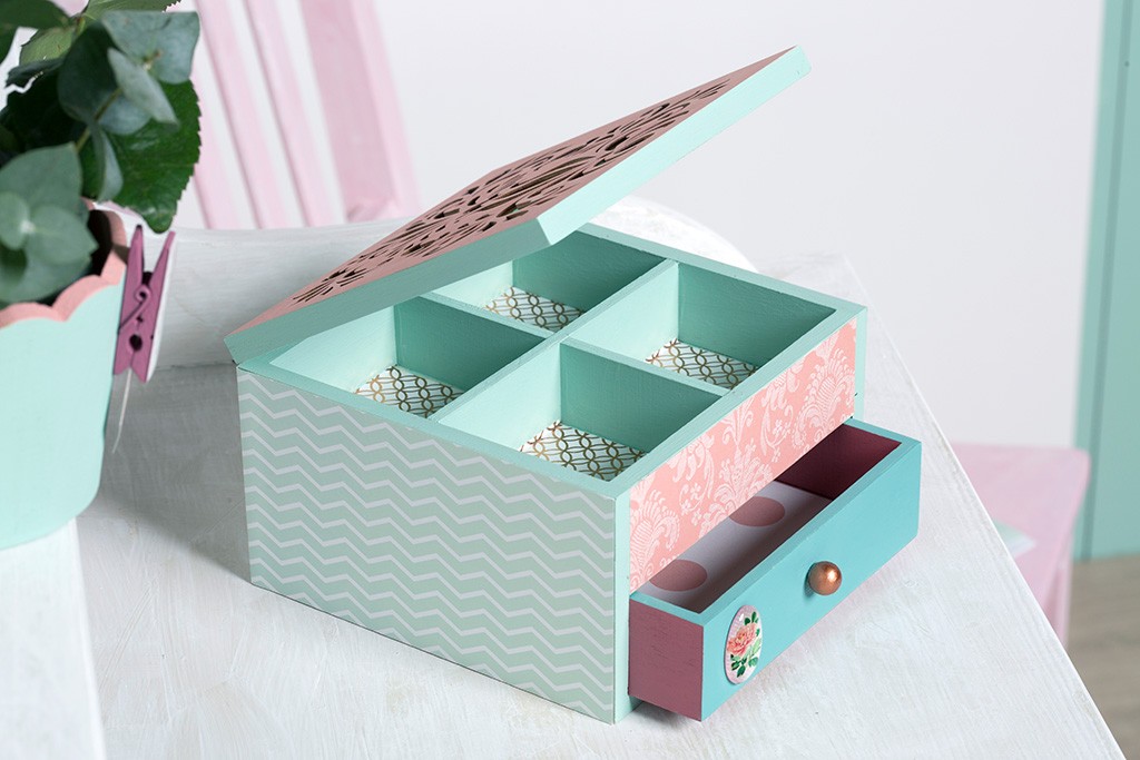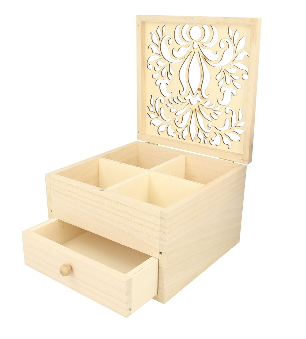 L'intérieur de son couvercle est ajouré. Elle est munie d'un tiroir et de 4 compartiments.
