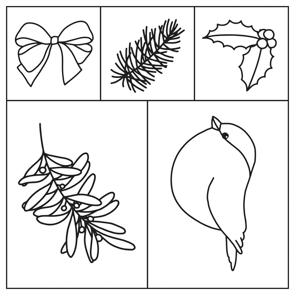 De stempels van de strik, tak en maretak meten 3x3 cm, terwijl de stempels van de vogel en het gebladerte 4x5 cm meten.