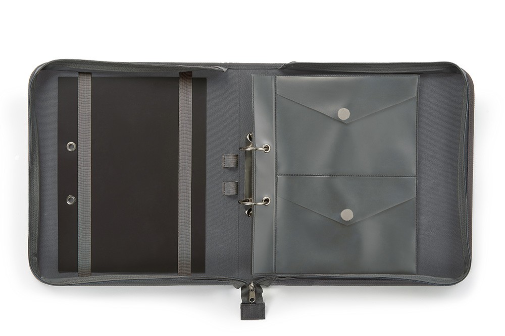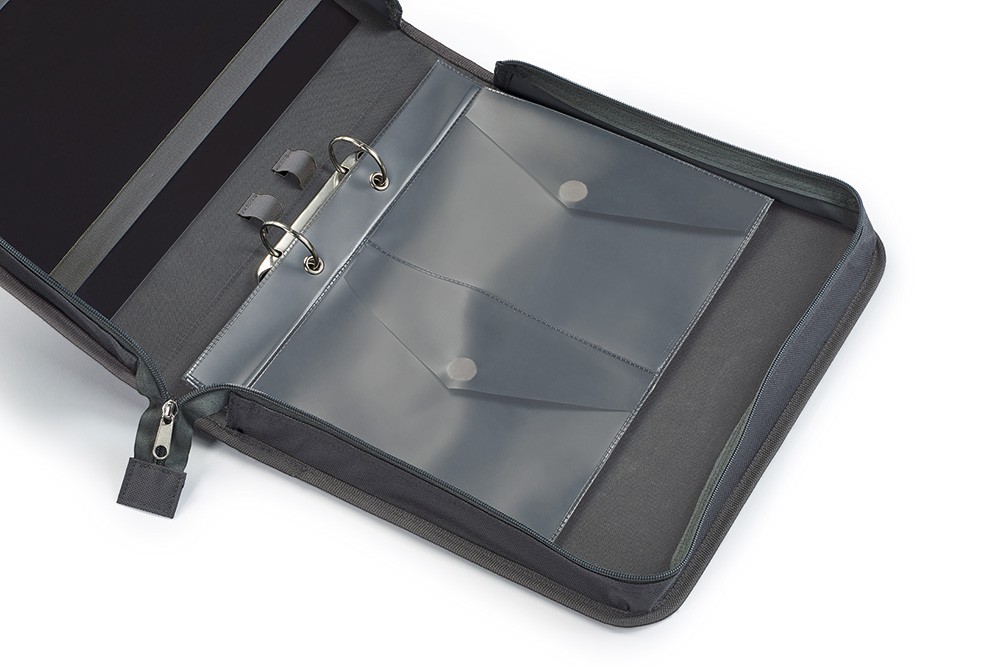 Het bevat een elastische band als extra opbergmogelijkheid voor jouw dies, 5 vakken met klittenbandsluiting en 1 magnetisch vel van 21x30 cm.